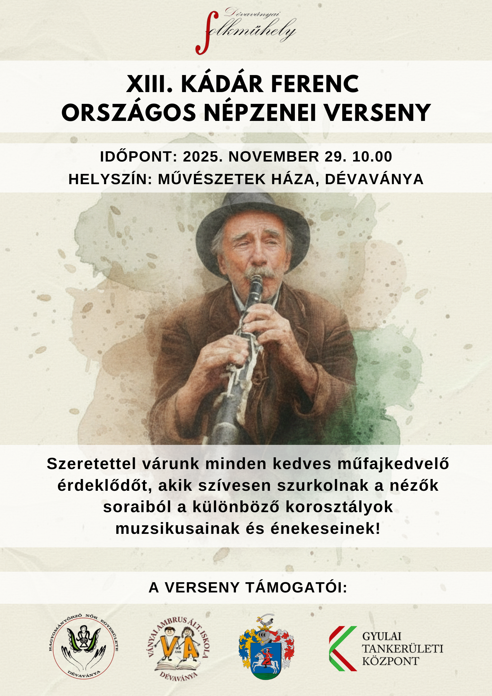 Szeretettel várunk minden kedves műfajkedvelő érdeklődőt, akik szívesen szurkolnak a nézők soraiból a különböző korosztályok muzsikusainak és énekeseinek!